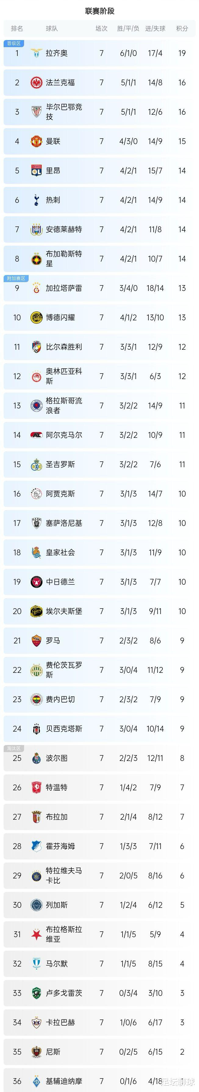 如今7轮过后,拉齐奥成为了首支直通十六强的球队,法兰克福、毕尔巴鄂同积16分,分列第二、第三,穆里尼奥的老东家之一曼联,豪取一波4连胜之后,积15分升至第四。